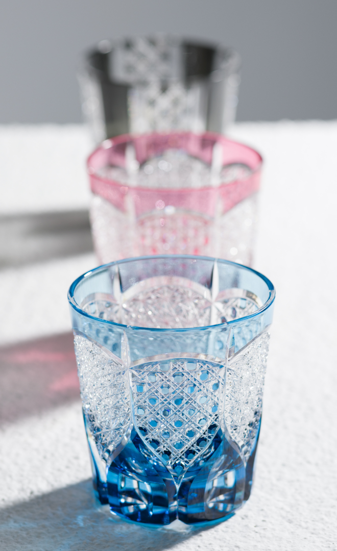 這一系列精美工藝品採用自江戶時代傳承至今的技術。每一件都是由經驗豐富的職人手工製作,切子細刻的精緻花紋,體現了職人的高超技術和努力的結晶。